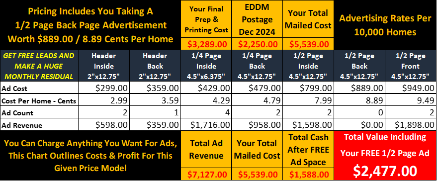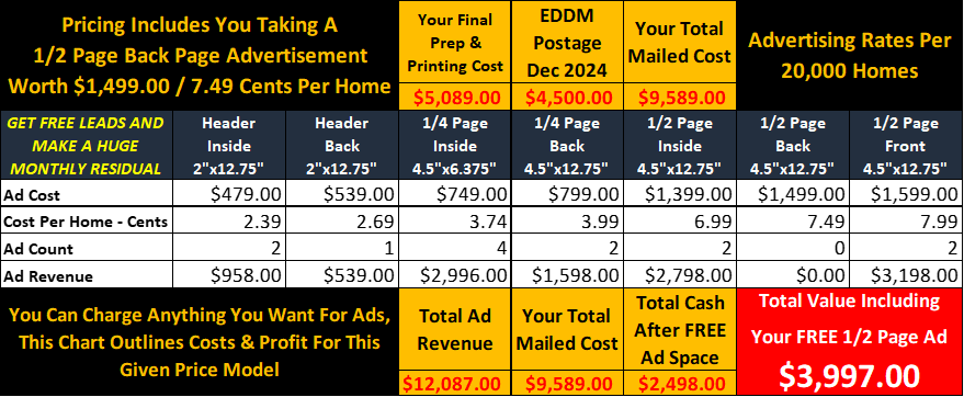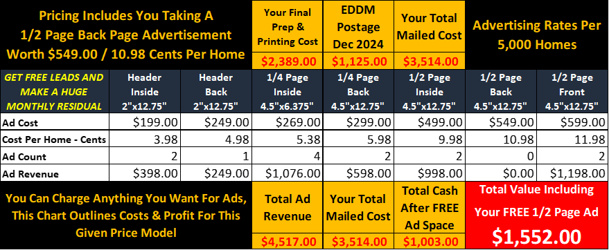 Your Cost in each table does not include UPS Shipping. Your Postage is based on 22.5 Cents Per Home (Dec 2024). Table below are for illustration purposes only to give an idea of potential costs and profits. To firm up all costs, please call to confirm all costs. Thank you for the opportunity to earn your trust & confidence!!!